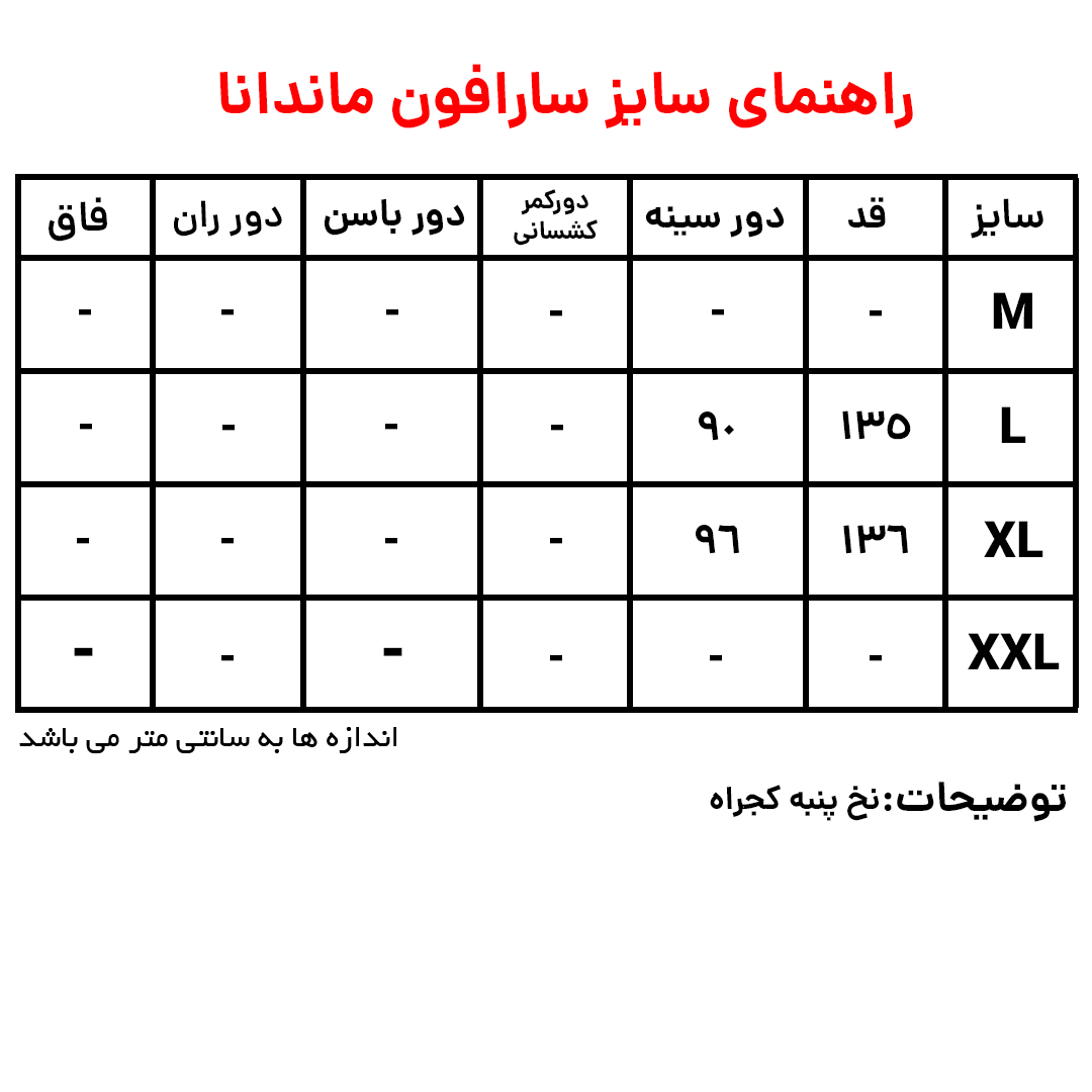 این سارافون یک مدل بلند و شیک است که با طراحی بلند، پوشش راحت و آزادی حرکت بیشتری ایجاد میکند و میتوان آن را بصورت تک یا همرا با رویه استایل کرد.